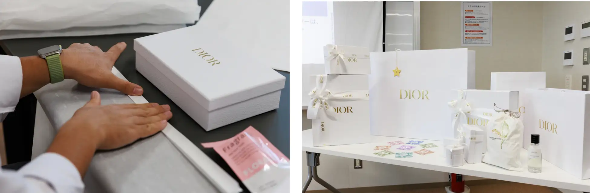 アート オブ ギフティング体験。ディオールのサヴォアフェールを感じるギフトの芸術を学び、創設者クリスチャン・ディオールの想いを探究。フレンチエレガンスの世界を体験しながら、大切な方への想いをメッセージカードに込めてギフトボックスを完成させました。