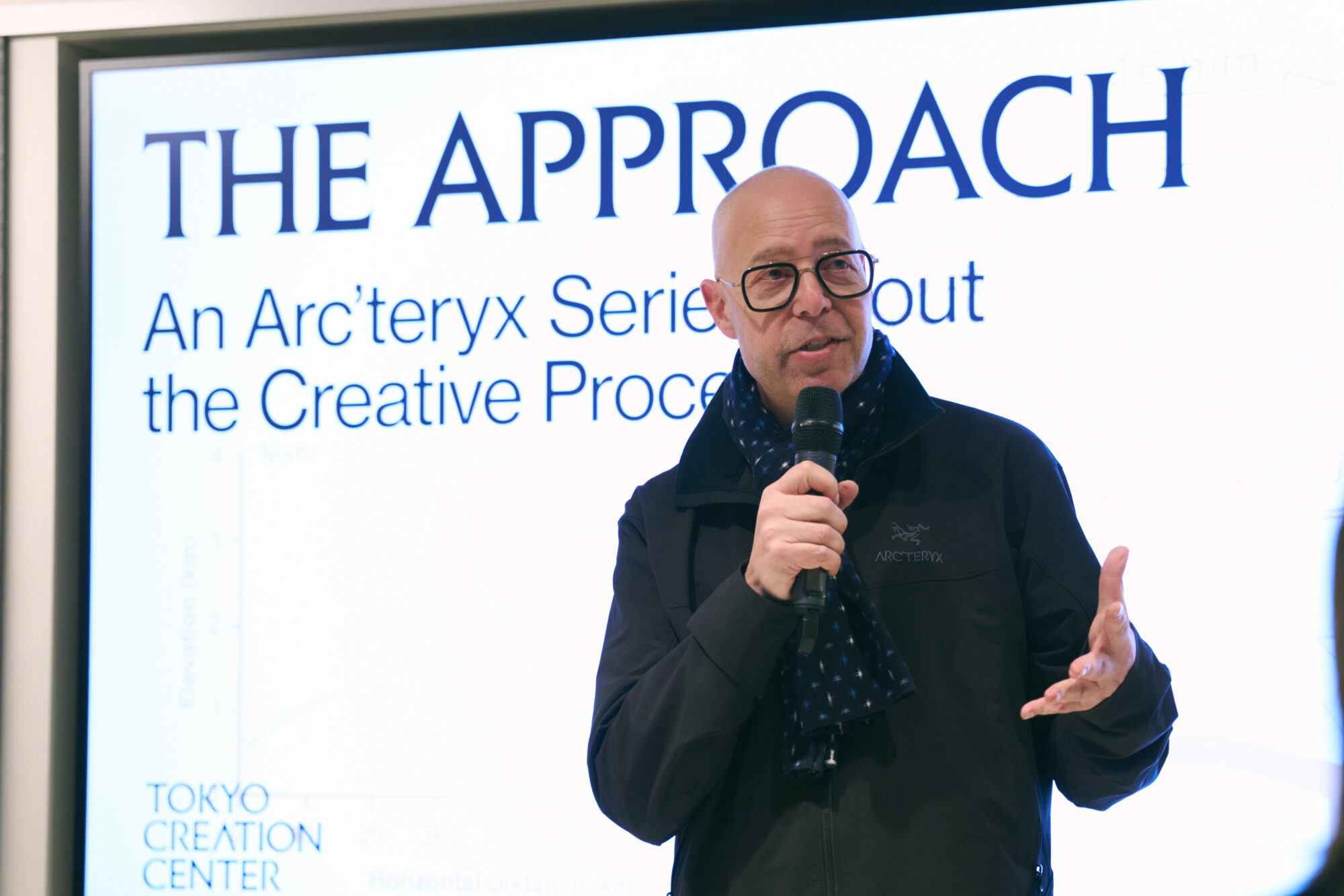 「皆さま、本日はお集まりいただきありがとうございます。まずは私から、東京クリエイションセンターについてお話させていただきます。アークテリクスは1991年、数名のスタッフでスタートした会社です。時を経て会社の規模は大きくなりましたが、原点である山やそこで活躍するアスリートの視点を忘れないという意識は創業当初から変わりません。今後ブランドが成長する上で、特定の地域や気候だけでなく、よりグローバルな視点で『山』や『アウトドア』を捉え直す必要があると考えるようになりました。そのため、私たちはできる限り多くの時間を山で過ごし、山に関わるアスリートやクリエイターと対話することを意識しています。さらなるインスピレーションを得るため、クリエイティブ、アウトドア、クラフト、イノベーションの中心地としてTCCを設立しました」