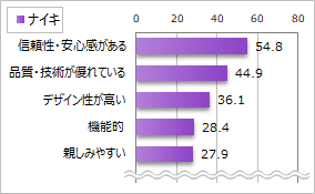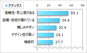 一番好きなブランド上位3位の「アディダス」「ナイキ」「ニューバランス」のイメージをみると、「信頼性」「品質」に次いで、「ナイキ」では「デザイン性が高い」、「アディダス」「ニューバランス」では「親しみやすい」が続きます。