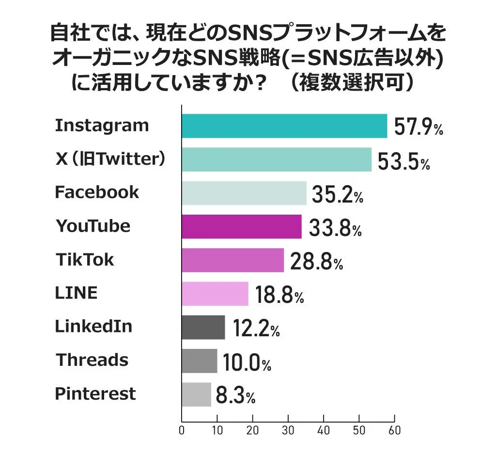 現在、オーガニックなSNS施策に活用されているプラットフォームとしては、Instagram(57.9%)に次いで、X(旧Twitter)(53.5%)、Facebook(35.2%)、YouTube(33.8%)、TikTok(28.8%)が上位に挙がりました。一方で、LinkedInやThreads、Pinterestなども一定の存在感を示しており、目的に応じたプラットフォーム選定の重要性が高まっています。