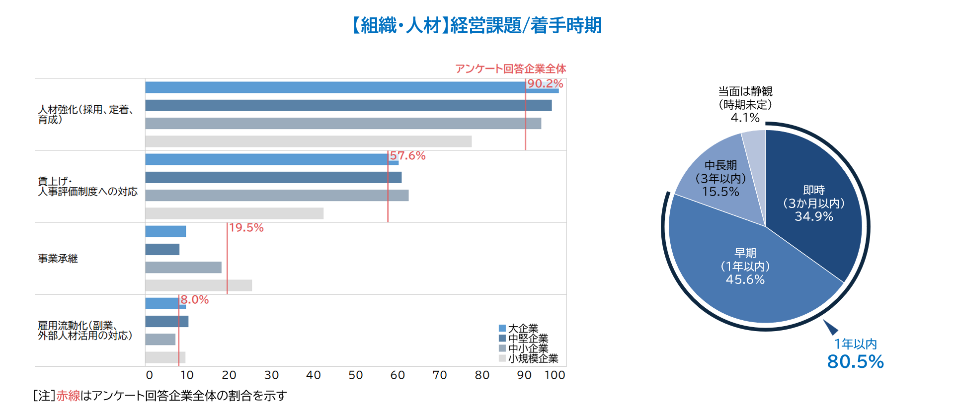 組織や人材に対する課題認識は「着手時期」にも表れています。「即時」と「早期」を合わせた「1年以内」に着手すべきとの回答が80.5%に達し、5つのカテゴリーで最も高い結果に。人手不足や採用競争の激化、デジタル人材の供給不足など容易には解消できない需給の歪みが広がるなか、企業が最優先で向き合わざるを得ないテーマであることが示唆されました。