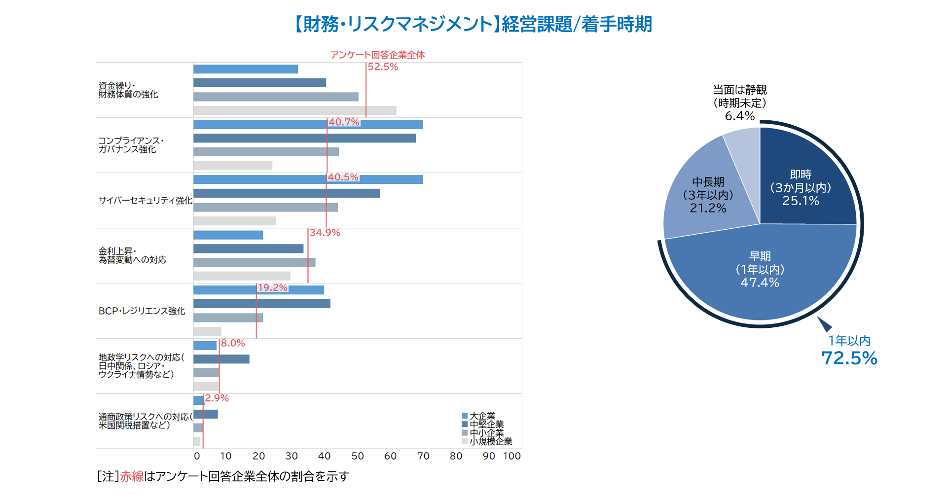 「財務・リスクマネジメント」においては、「資金繰り・財務体質の強化」が52.5%と最も高く、特に「小規模企業」は61.9%と喫緊の課題として浮上しています。原材料やエネルギーコスト、人件費の高騰だけでなく、金利・為替、地政学リスクなど外部環境の不確実性が高まるなか、財務基盤を強化しつつ、変化に備える姿勢がうかがえます。