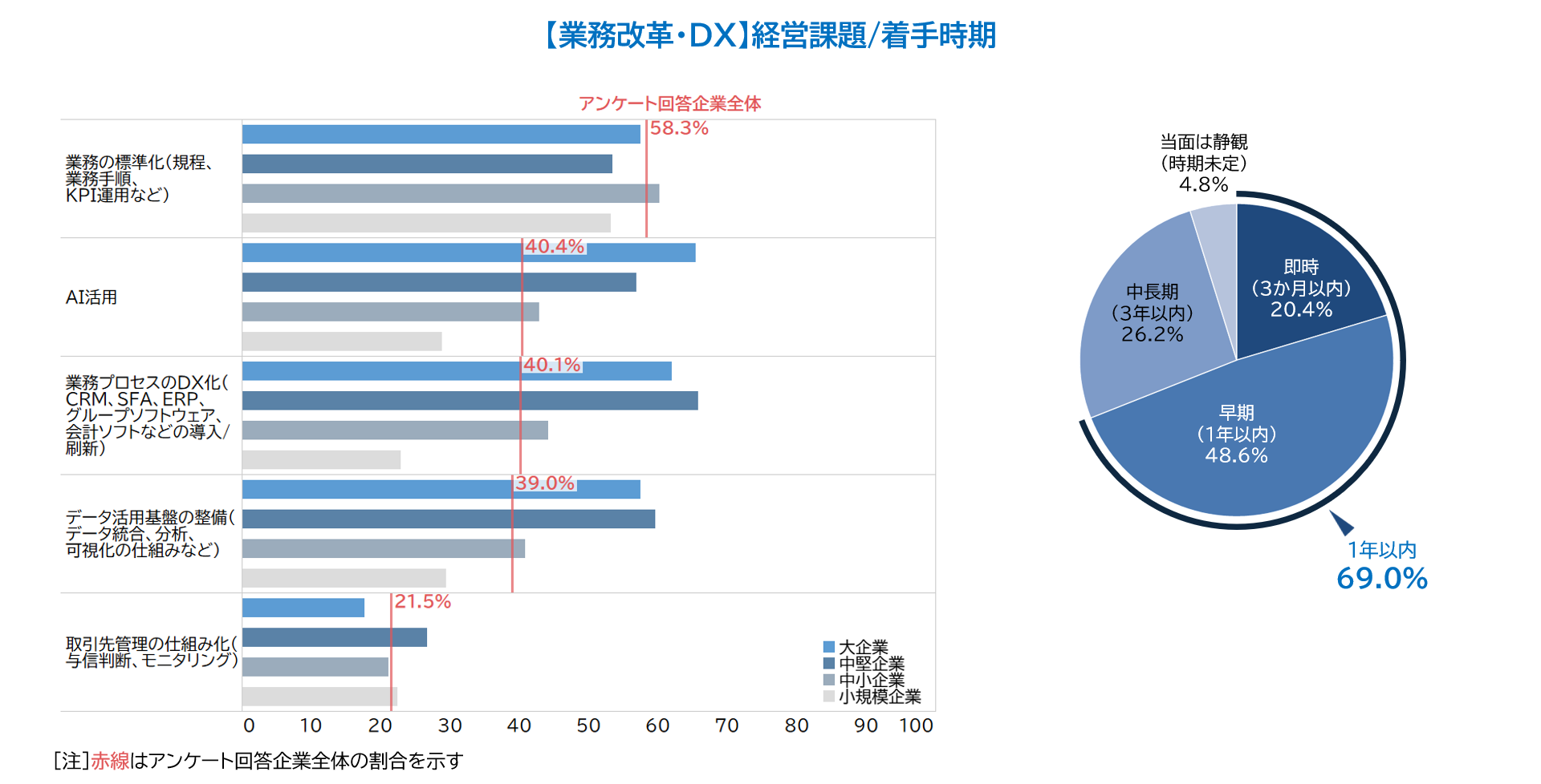 着手時期では、「1年以内」70.0%のうち、「即時」をみると27.8%で「組織・人材」の34.9%に次いで高く、成長領域への投資に早急に取り組もうとする企業が多いことが示されました。
