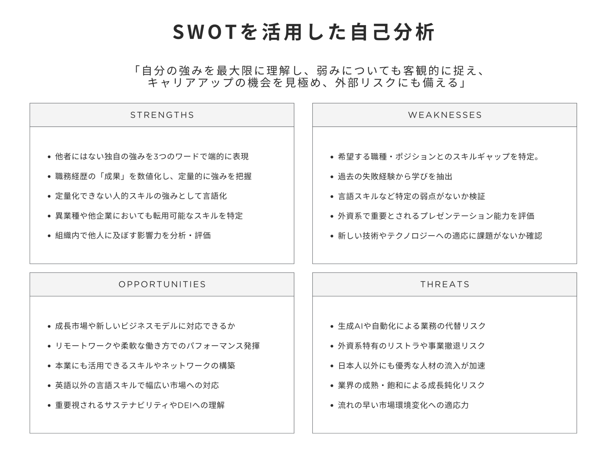 今回紹介したSWOT分析の4つの視点を自分自身に当てはめることで、定量的な実績だけでは見えてこない非認知スキルや文化的な柔軟性まで浮かび上がらせることができます。